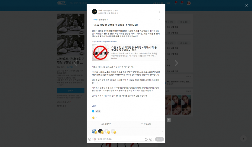 원래는 피해를 본 여성에 한정된 만남피해여성모임 비공개 밴드였으나, 최근에 리더님이 바뀌면서 밴드명 변경, 가입 타켓을 만남을 하거나 하려는, 또는 피해를 본 전체 여성으로 확대하였으며 또한 공개 밴드로 전환되었습니다.