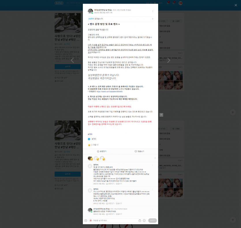 너무 이성을 쉽게 접근하는 분들이 많다고 판단하여 저희는 1차적으로 밴드내의 채팅 기능을 제한했었고요.