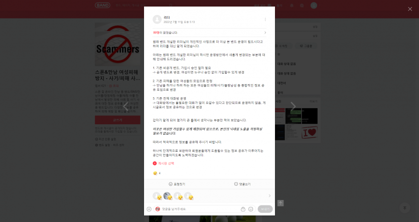 아래는 원래 밴드 개설한 리더님이 하시던 운영방안에서 새롭게 변경되는 부분에 대해 안내해 드리겠습니다.